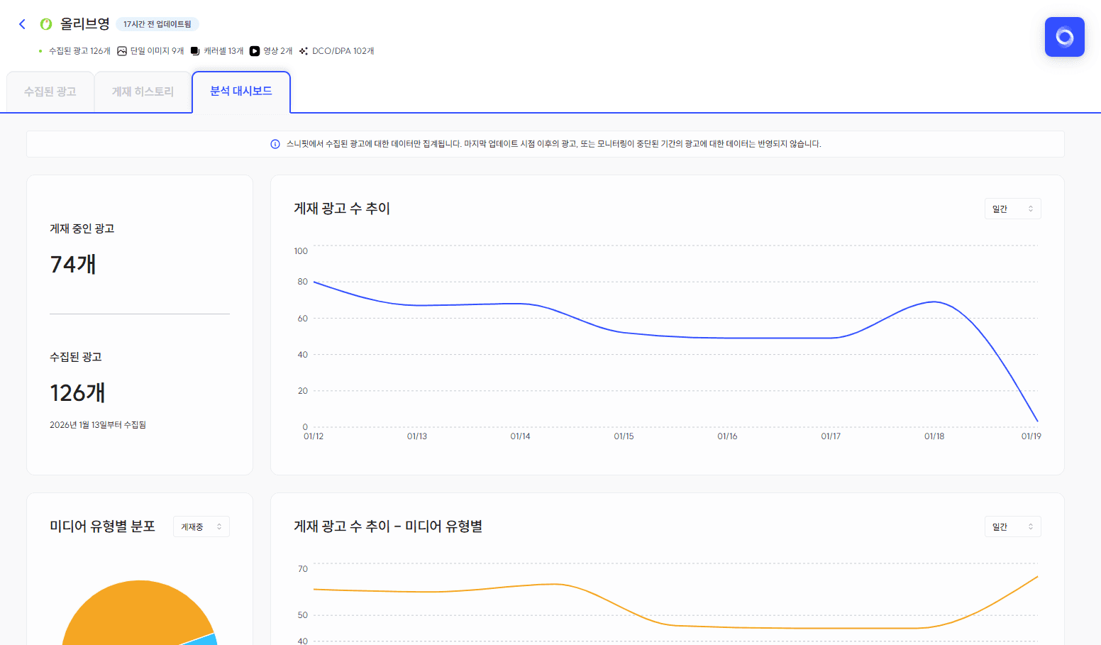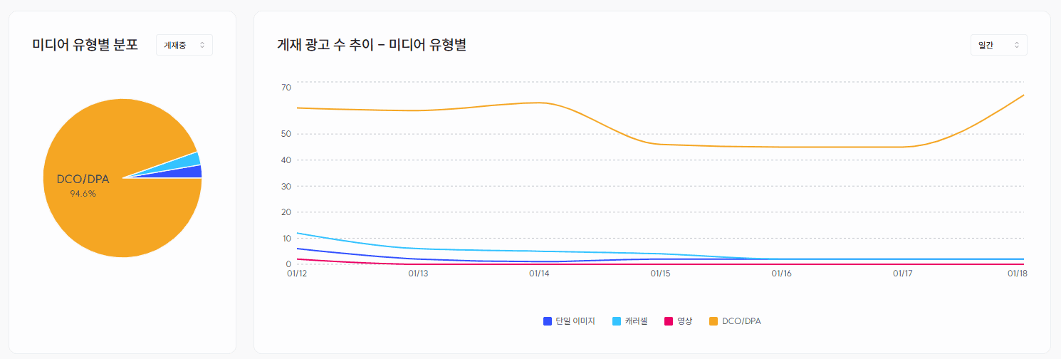 (게재 광고수 추이, 미디어 유형 분포, 게재 기간 분포 등)