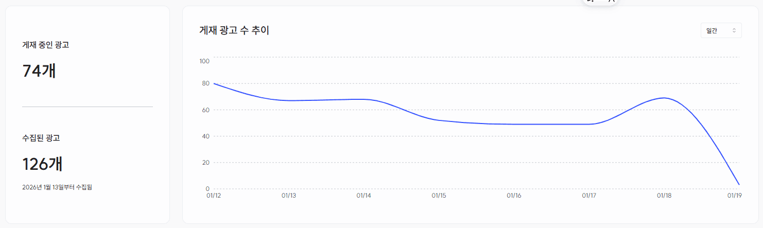대시보드에서는 수집을 시작한 이후 경쟁사의 일간(기본) / 주간 광고 운영 변화를 라인그래프로 확인할 수 있어요.