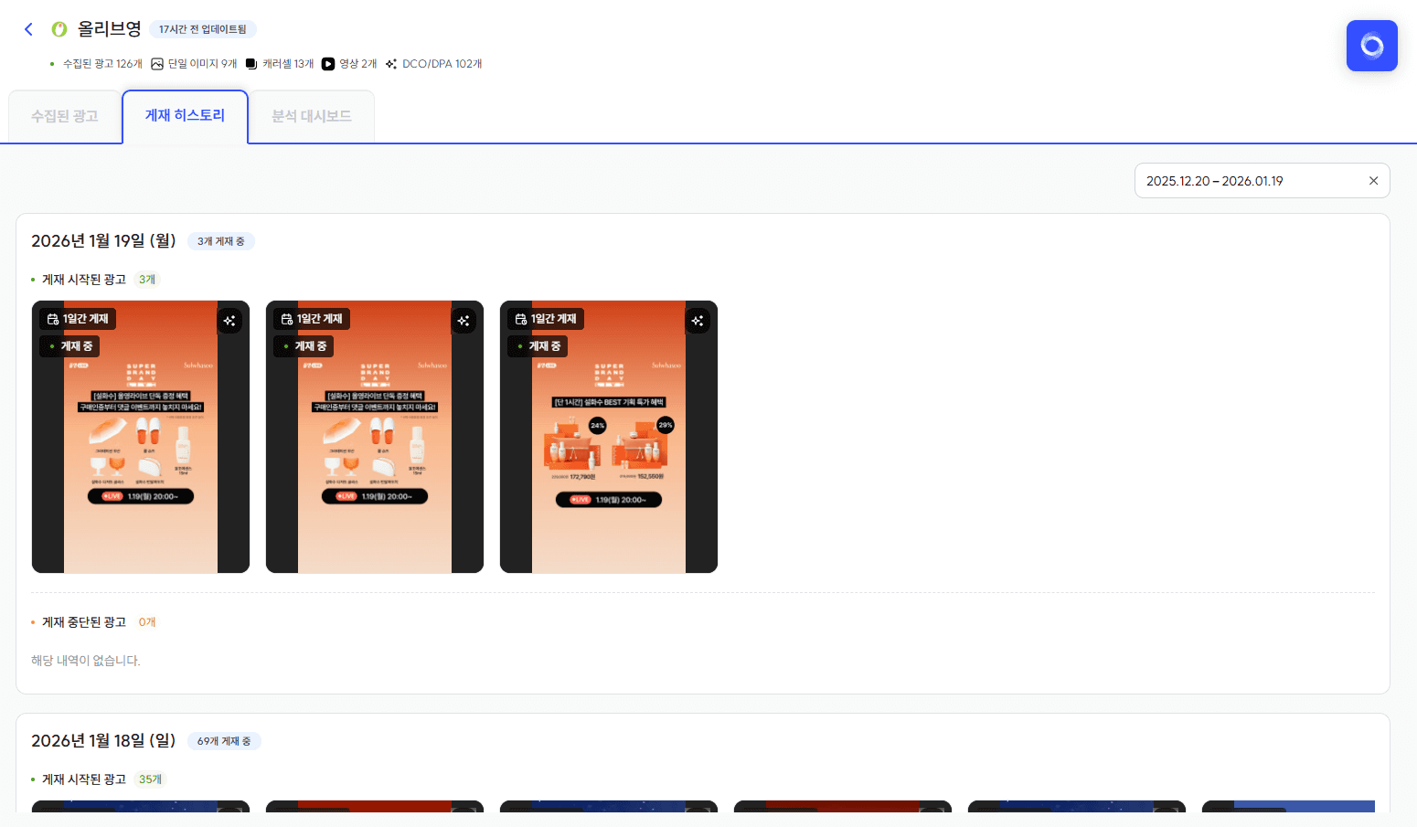 광고의 ‘현재 게재 중인 상태’뿐 아니라, 일자별로 게재 시작/중단된 광고를 피드 형태로 확인할 수 있어요.