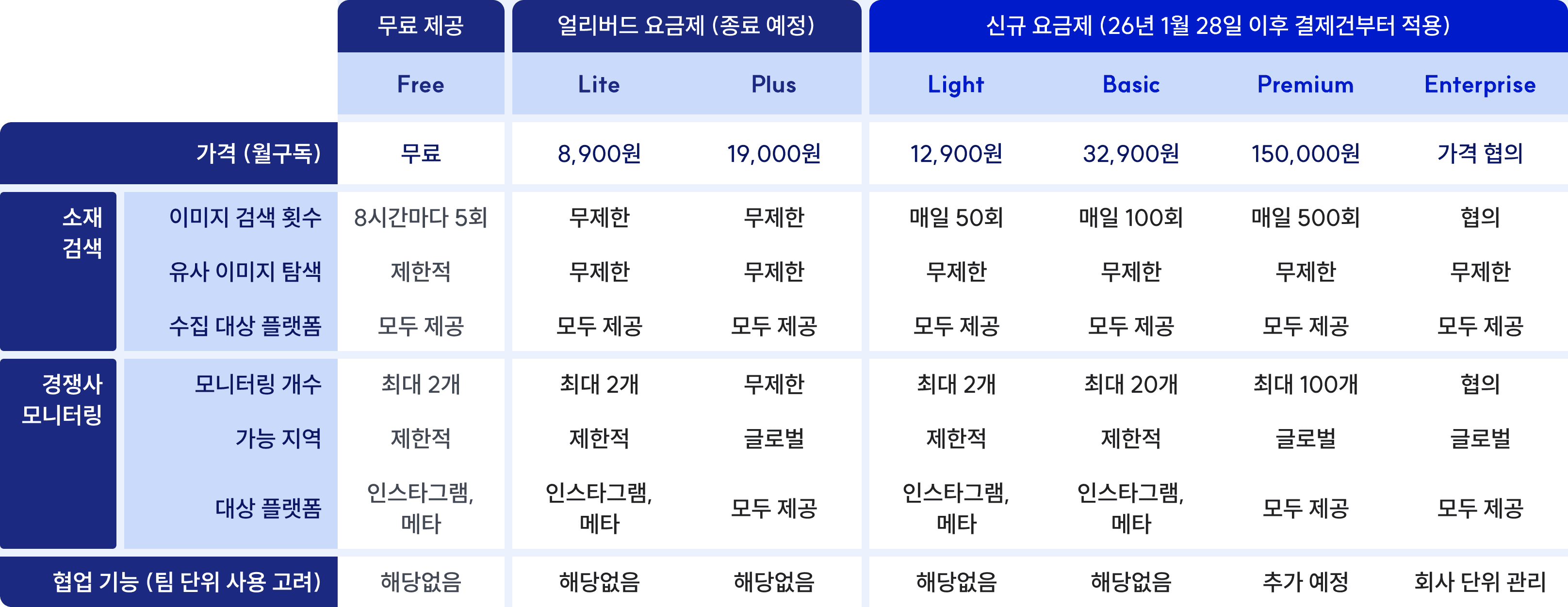 요금제별로 검색 횟수, 모니터링 개수 등을 세분화해