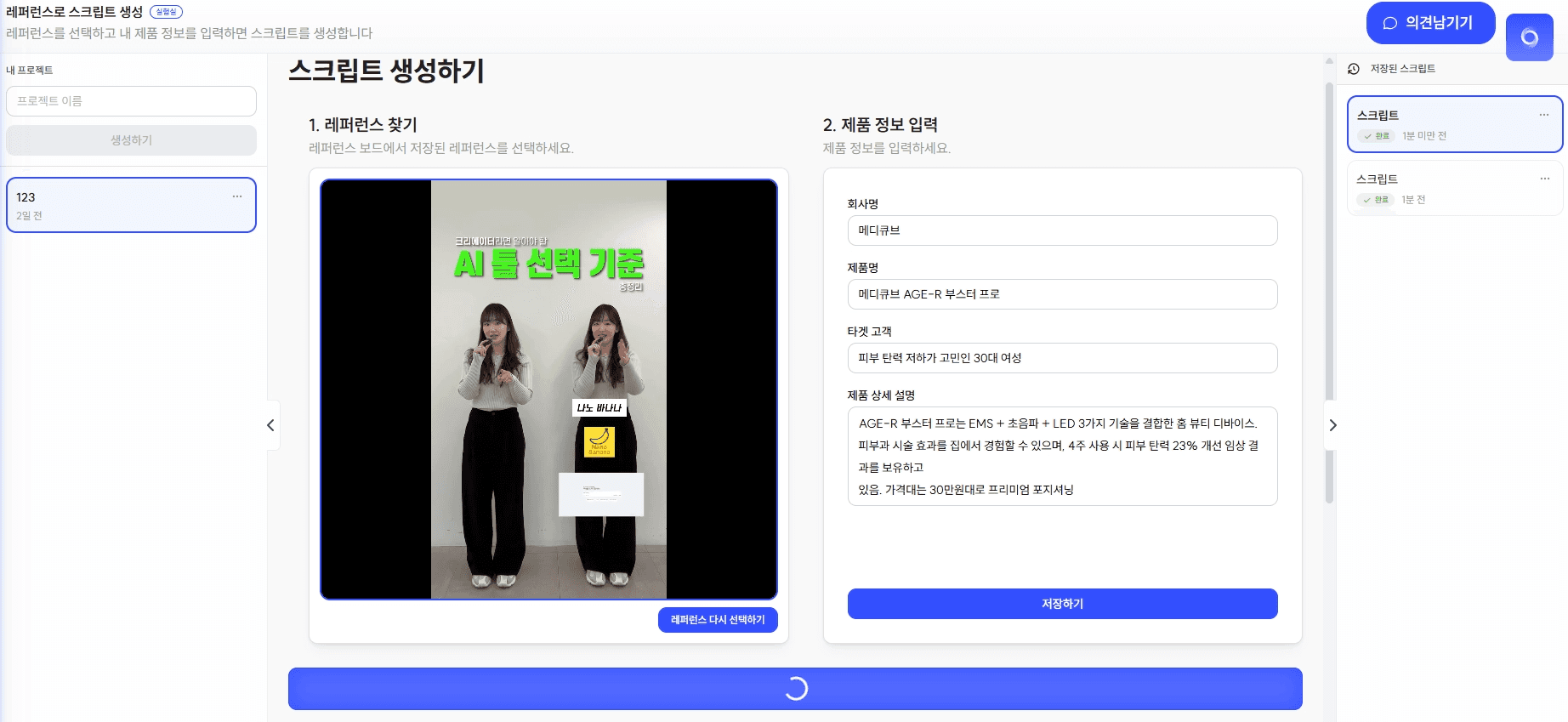 보드에 저장했던 레퍼런스 중 스크립트가 마음에 드는 레퍼런스를 하나 선택합니다.우측의 ‘제품 정보 입력’ 창에