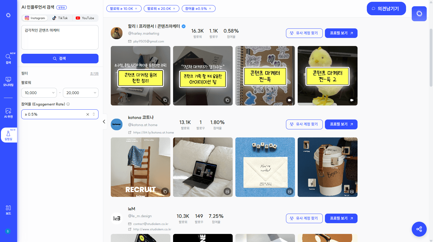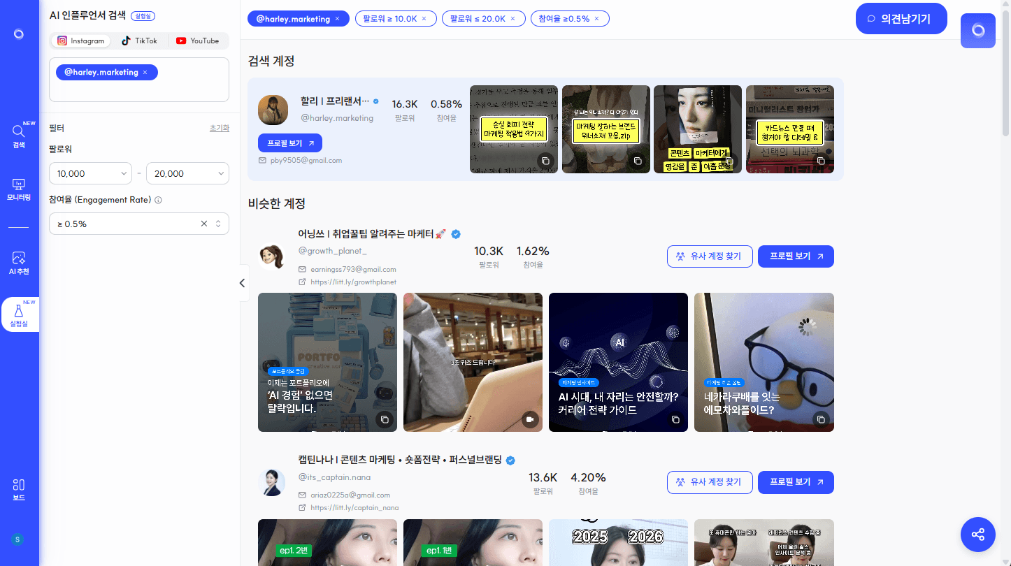 5. 그리고 실험실에는 AI 인플루언서 검색 기능도 새롭게 추가되었습니다