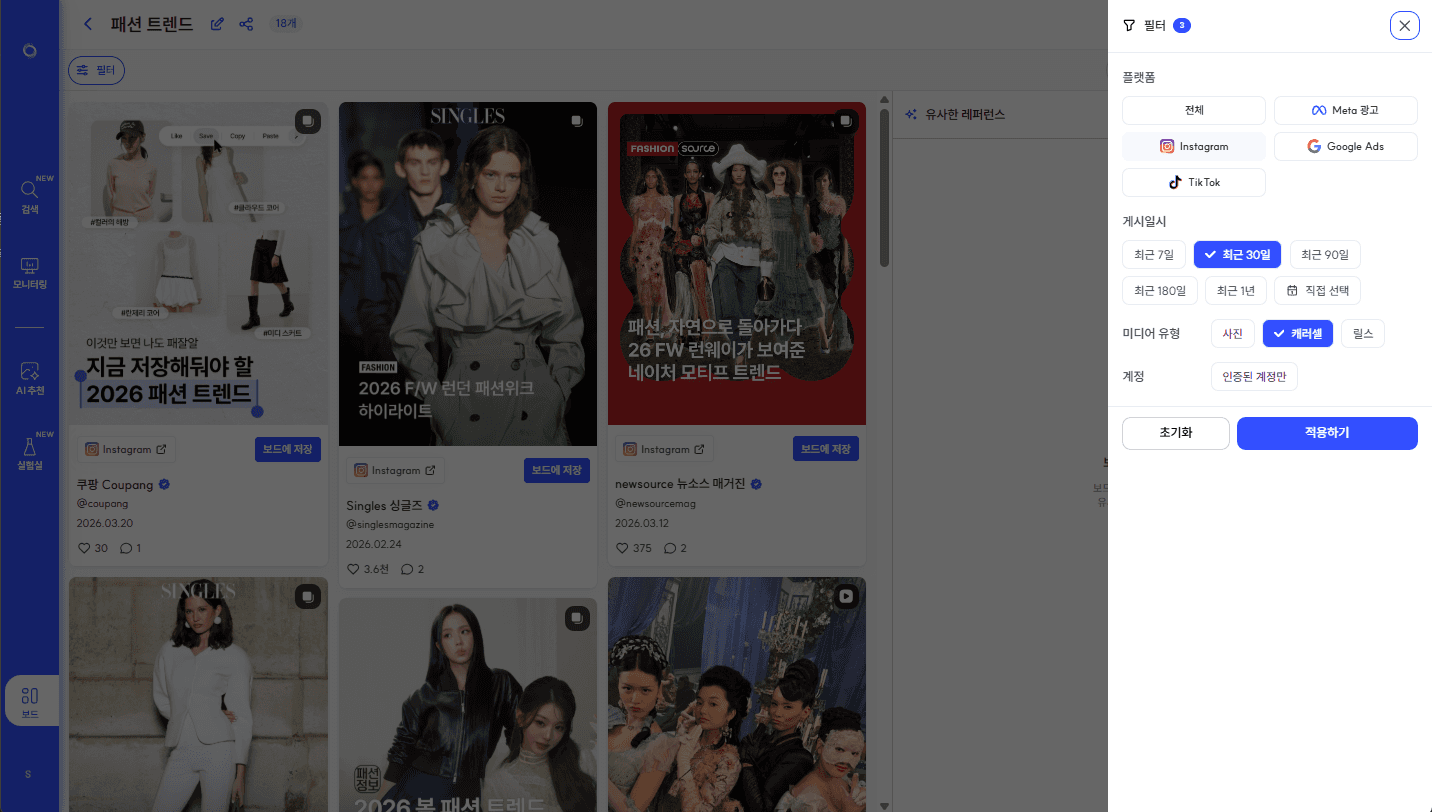 최근 올라온 패션 매거진형 레퍼런스를 한눈에 훑어볼 수 있게 됩니다.