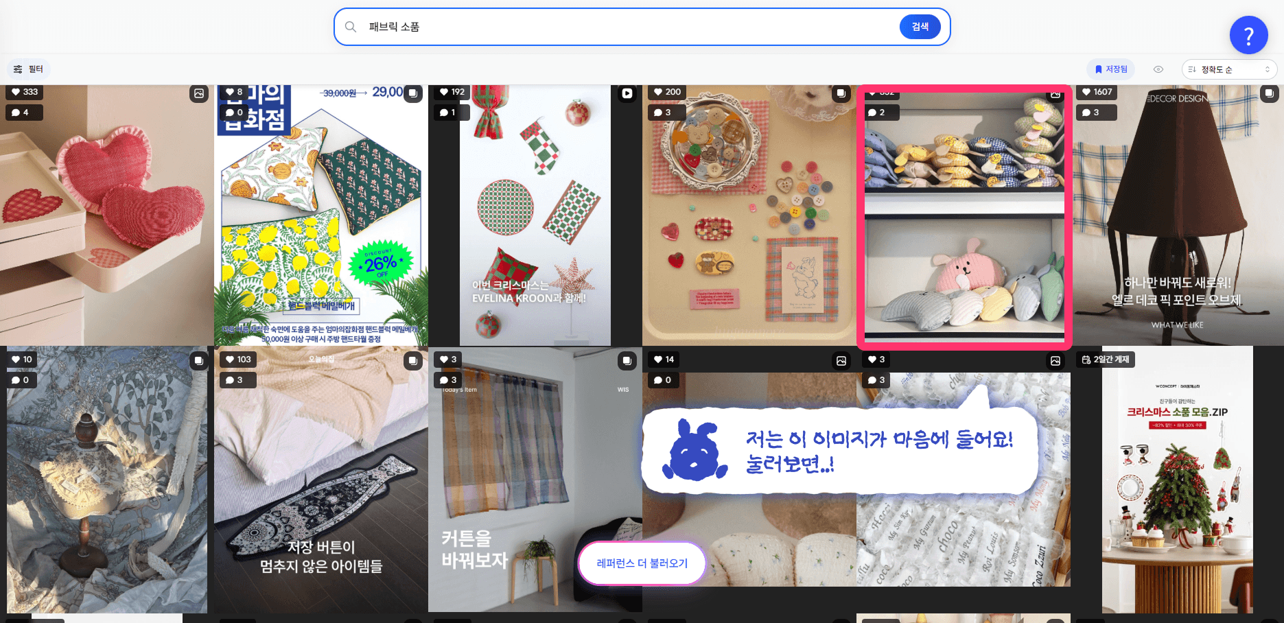 또 해당 소재의 유사 이미지 추천으로 이어지는 탐색 과정도 경험해볼 수 있었어요.