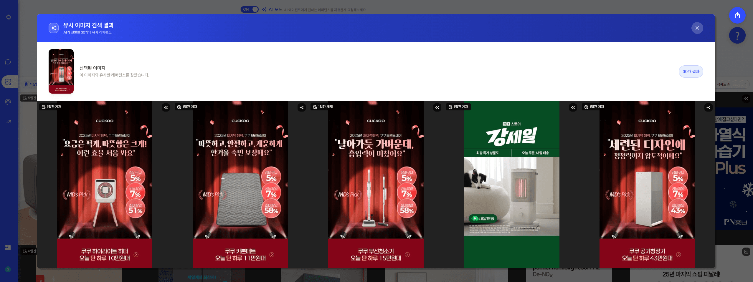 AI가 알아서 카테고리, 플랫폼, 게재일시, 성과 등의 필터링을 적용한 이미지 검색 결과를 불러와요.