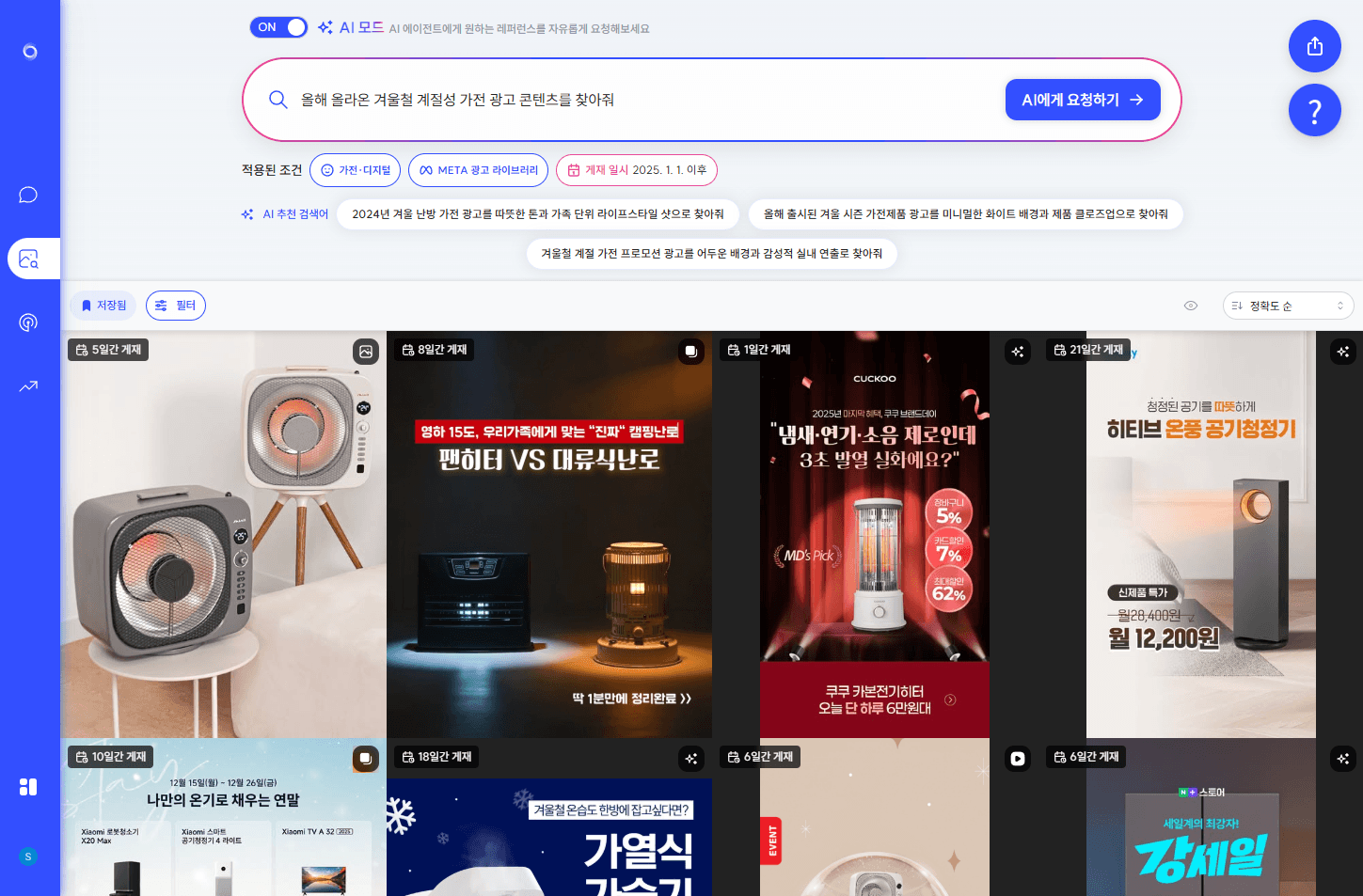 실제로 "올해 올라온 겨울철 계절성 가전 광고 콘텐츠를 찾아줘" 라고 요청한 결과,