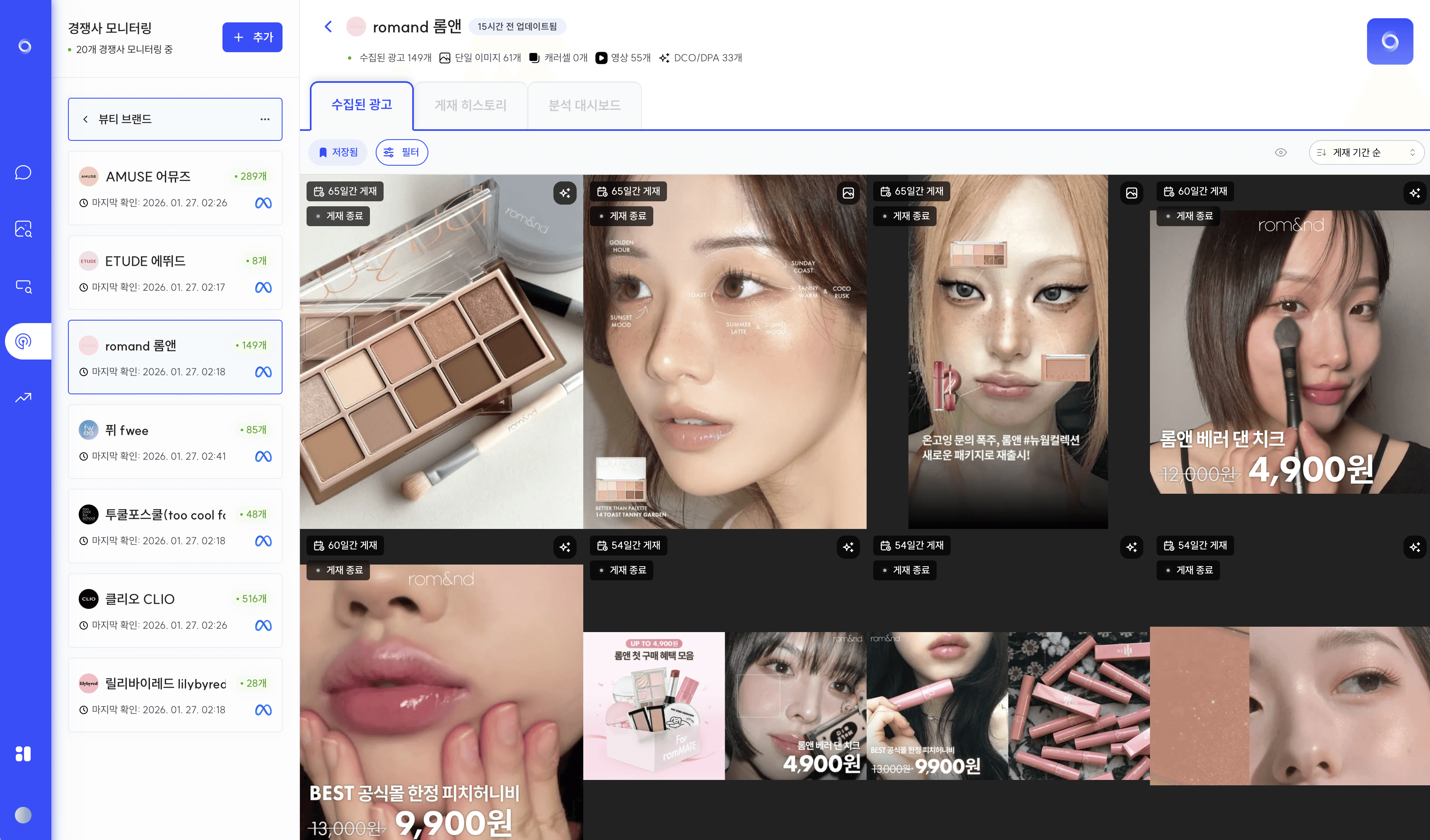 수집된 광고 탭에서는 현재 운영 중인 광고 전체를 한눈에 확인할 수 있어요.