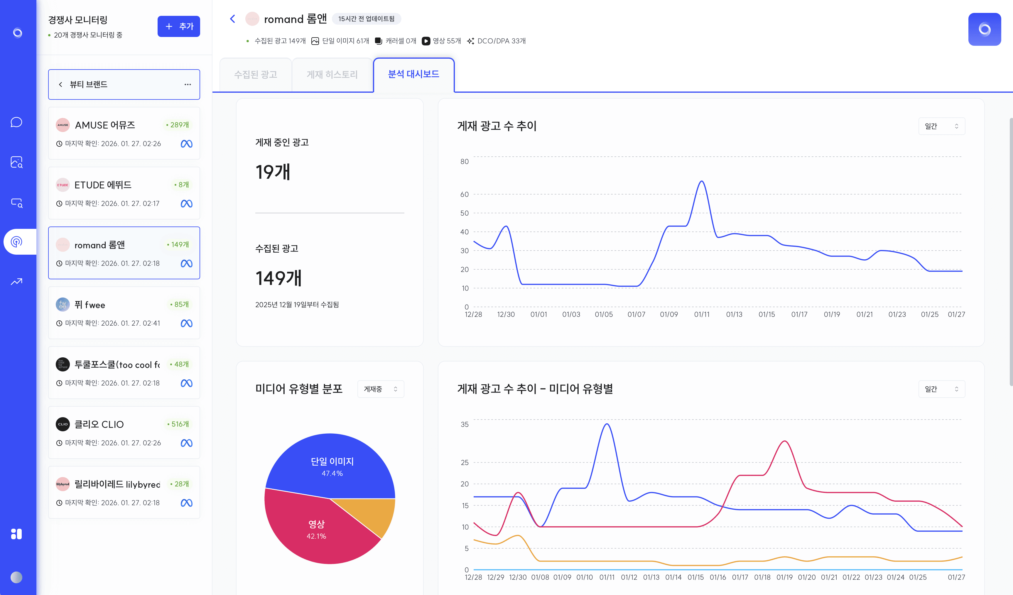 브랜드를 등록하면 해당 브랜드의 광고가 매일 자동으로 수집·저장되며,